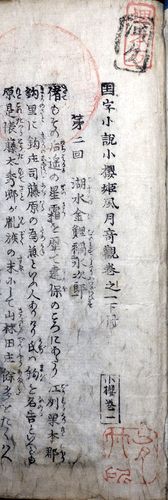 作者曰、此書稿本の時、此回につゞきて蘆中の扁舟玉笛を弄すといへる一回あり。則この回のうちに圖したる、水二郎金鯉魚の美童に變ずるを視る話、また美童舟中に笛を吹て湖中に泊舟せし旅客を魅す話なり。一回すべて四幀の圖を加へ、已に脱稿つれども、梓行にのぞんで雕版の巧を軽せんために、本文の小徑なれば是を除かしむ。画圖は児曹の目を歡しむるために、その一ッをのこせり。このゆゑに圖あつて事を記ず。閲人あやしみ給ふべからず。此末巻中の圖画に写して趣あるをのみ画しむゆゑに、本文と前後する所あり。読者次第に拘ずして照し視給ふべし。