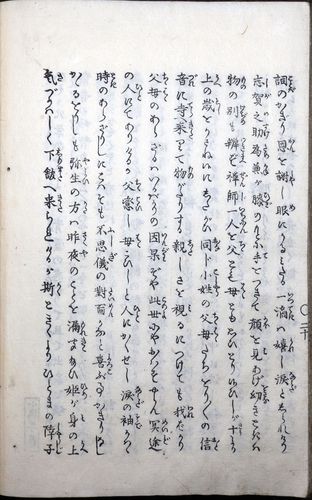 為兼これを聞れ、清若が身に災ありしとは気遣し。近うよりてはやく其仔細を申せと曰へば、弥生の方はとゞろきの橋打渡る胸のうち、騒ぎ立気をしづめてもしづめかねてぞおはしける。水二郎やう/\に漆行出、ありししだいを詳にのべければ、為兼始終を聞玉ひ、打驚せ玉ひしが、さすが連忙し介もせず、輪迴に絆恩愛も、胸の鋼鉄に思ひ断る、武門のこゝろぞやるせなき。おんいたわしや弥生の方は、人目も耻ず打臥し玉ひ、声をあげてぞ嘆かるゝ。