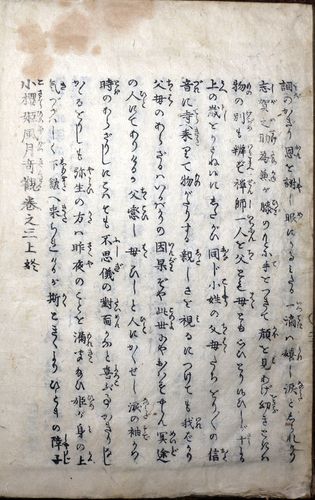 偖も小櫻姫は、ゆくりなく情人にめぐりあひて、愛着の心火に一点の薪を添、ます/\思ひを焦しけるが、さてある夜一睡の夢破れて、床のうちに起なをり、枕辺にありつる絹ばりの團扇をとりて胸間をしづやかにあふぎつゝ、残燈にさしむかひたるさま、芙蓉水をはなれて半輪の月に香艶を放が如し。宵にきゝつる〓衣の音も、いつの程にかうちやみつ、庭にすだく虫の音は、いとちかくなりぬ。泉水へさしいるゝ潮の水門を潜る音さへ冷わたりて、夜はいたく更たりとおぼゆ。姫は心澄てふたゝびいねもやられず、蚊〓をくゞり出て上の坐敷にいたり、妻戸よき程にをしあけて、庭前を見れば、月は松の梢にさしいでゝ、影を池水に浴し、名所の種をうつして、池のほとりにうえたる萩ども、露おもげにたはみふし蒔石のあはひ/\には、桔梗女郎花のたぐひ、清らかに咲満、箒目絶ぬ廣庭も、夜るは埜ずゑの景色して、種々の虫ども自恣に、音をたて常に目馴し前栽も、いと興あるながめなり。