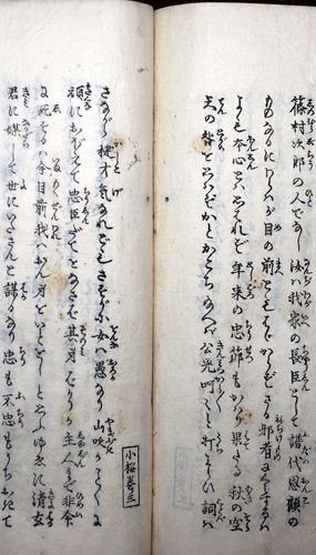 小年は姫にむかひ、かゝる野ずへにてなやみ給ひ、さこそわびしくおぼすらめ。今すこしくすりを用ゐ給はんやといふに小櫻姫、此時はじめて頭を擧、此人を見るに、豈量んや此人はこれ、日比戀したひて病となり、玉かつらの影見にそひ、苅萱のつかの間も忘れざる、清水寺にて見初たる、かの美少年なりけるにぞ、曾おどろき曽喜び、積もつかへもどこへやら、寐衣すがたの不束を、見せる思ひのはづかしく、逢でこがれしほたる火は、數にもあらず眞澄鏡、照月影も山の端を、はなれて