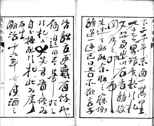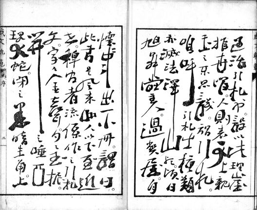 引札者何。謂立代物之効能。欲令客買焉之使者耳。腐儒講孔子道。坊主説釋伽教。亦是其道之使者。不過活引札也。設以此理崖指世間。人則表可上親玉之不思議。謂引札。嗚呼引札之種類亦滅法澤山歟。頃日旭昇堂主人。過弊屋。自懐中出一小冊。謂曰。此書是風來山人以下至近世。稗官者流係作之引札文。字々金聲。句々玉振。開之唾壺現大蛇。閉之愚暗生角。上下二千年。東西十萬里。大千世界雖廣。於引札文。恐莫出此右者。請校閲序之。叩帝先述其効能。余取之寐倒讀過一遍。已曰。吾所欲言。子皆謂立。更無有餘地。何遑用吾筆頭之引札。乃大笑書有之儘。為自分操觚引札。此為序為之。