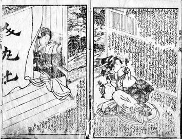 一方、中世の勧進比丘尼等に拠って担われた〈絵解き〉は、文字の代わりに絵画を主体にして分かりにくい話柄を易しく解明かす〈語りもの〉であった。この絵解きの流れを汲んだものと想像される〈草双紙〉は、画工 (浮世絵師)が挿絵を描き、その透き間に画工自らが本文を書込んだことから始まったもので、全丁絵入で挿画と本文(詞書き)とが渾然一体となったものである。この大衆小説を代表する草双紙というジャンルは、赤本に始まり青本、黒本、黄表紙と、本としての装いを変化させながら近世期を通じて刊行され続けることになる。後に作者が画稿(下絵)を描き、画工は作者の画稿に基づいて清書するという分業制が確立し、化政期の合巻になると美麗な重摺りを施した錦絵風摺付表紙に序と口絵とを備えるようになる▼1。