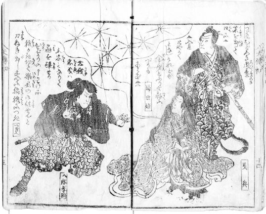 ところが『八犬伝』を抄録した草双紙『雪梅芳譚犬の草紙』四編下冊(15ウ16オ)や浄瑠璃本『八犬義士誉勇猛』上冊(8ウ9オ)、